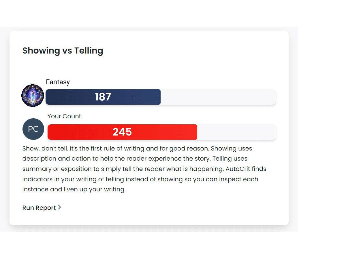 Any AutoCrit tools that utilize AI are purely assistive – designed to help you overcome creative blocks, identify narrative problems, and discover new ideas.