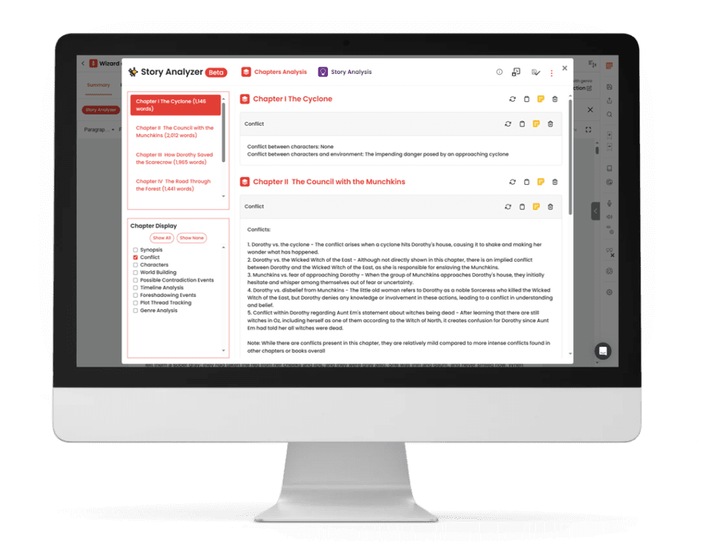 Track conflicts throughout your story and ensure every setup has a payoff. If something falls to the wayside, you’ll know about it in moments.
