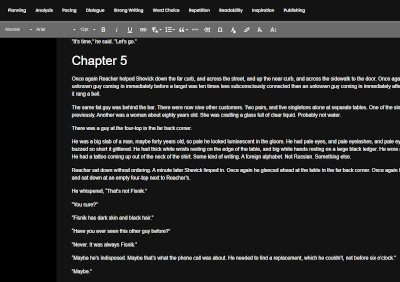 The Writer's Desk delivers one of the most fully-featured word processing environments you'll find in any writing app. Chapter organization, bookmarking, formatting tools, dark mode, dictation, note boards and more are all right here, with seamless navigation through your entire manuscript. Everything you need, nothing you don't.