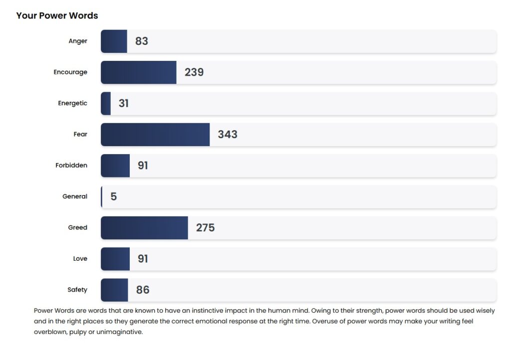 The Power Words report shows you exactly how your deployment of emotionally charged language is influencing the reader's experience. Are you building the mood you intended? Is your romance accidentally reading like a thriller? Is your horror losing its edge because the language has gone soft?